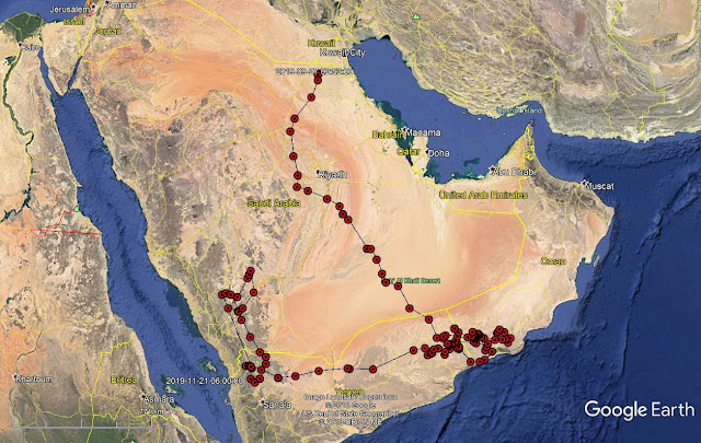 The bird mapped below, 186, migrated into Arabia on 28 September, and flew to Salalah, where it spent last winter. Finding the rubbish dump there closed, it moved back to Yemen, then to SW Saudi, and is now back in NW Yemen. One can see clusters of locations along this route, where the eagle probably found enough food for it to dwell there for some time.